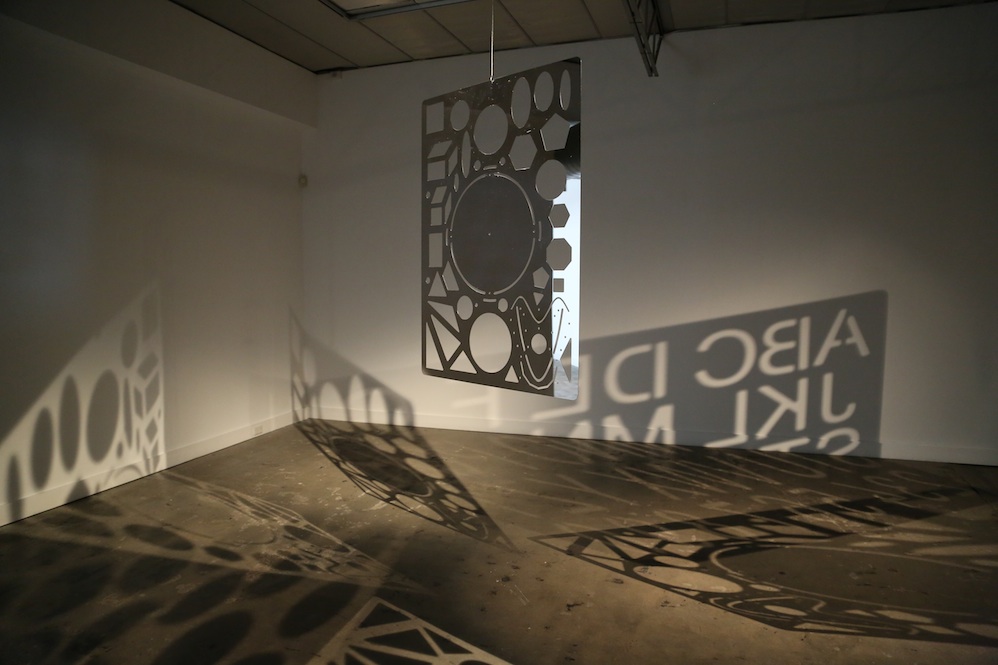 These works are derived from a constellation of thoughts to do with the notion of wholeness and the implicate order explored by physicist David Bohm in his text of the same name. In that book the central underlying theme is the unbroken wholeness of existence as an undivided flowing movement without borders. His text conceives a reality of space and matter, thoughts and things entire, rather than a realm of separate entities. The large screen works are plays on these ideas, merging measure and language with reflection and shadow. Bohm imagines a reality that is explicate, unfolded, from a far greater implicate order, a plenum of immense oceanic energy: